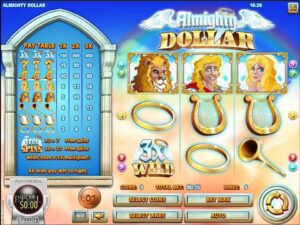 The 450-coin top jackpot is only awarded to players who select how many coins and lines to activate during their spins. Players will take advantage of multiplying wilds and Heavenly Free Spins in Almighty Dollar, which is a medium variance slot game. The denominations range from $0.01 to $5, with 1 to 5 active lines, and 1 to 3 coins per line.